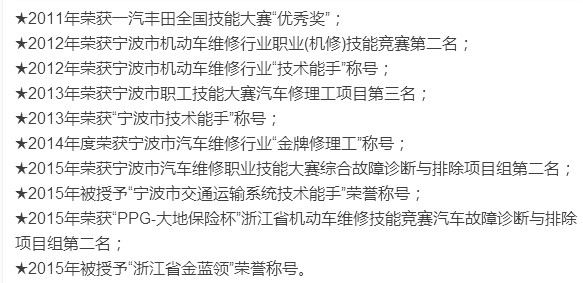 作为一名技术人员,张伟始终把经验累积和技术提高作为自己第一目标,入职8年间,经过张伟维修或质检的车辆已累积达到2万余台。经过自身的不懈努力和公司的栽培,张伟荣获多项殊荣。