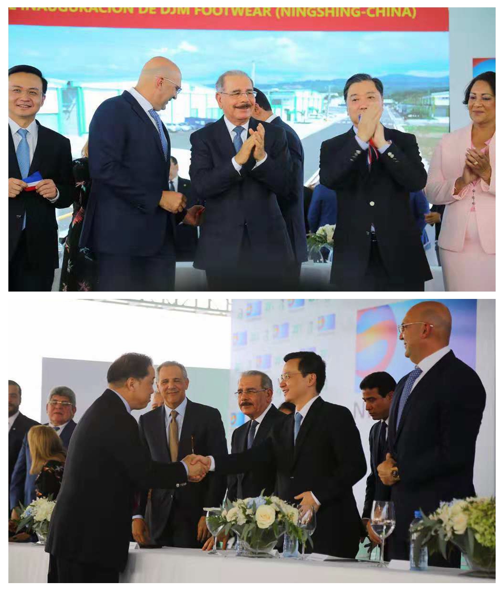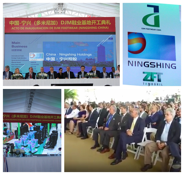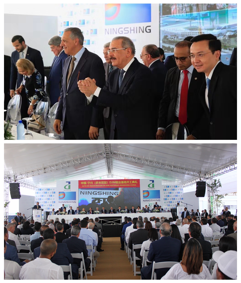 中国与多米尼加于今年5月1日正式建立外交关系。作为中多建交后的中国企业的首个实业项目,本次宁兴DJM鞋业开工典礼受到有关各方高度重视和广泛关注。多米尼加总统梅迪纳、中国驻多米尼加大使张润应邀出席开工典礼。陪同梅迪纳总统出席典礼活动的还有多米尼加政府部门的重量级官员。宁兴控股董事长吴以刚、副总裁黄永增、宁兴贸易集团常务副总张磊以及宁兴鞋业有限公司总经理童小建、副总经理许光杰和控股总部有关部门负责人顾伊琳、盛斌等一行七人组成代表团专程赴多米尼加参加开工典礼。受邀参加的还有来自多米尼加有关商会、企业代表等,全场共有260多人聚集一堂共同庆祝宁兴(多尼米加)DJM鞋业基地正式开工投产。