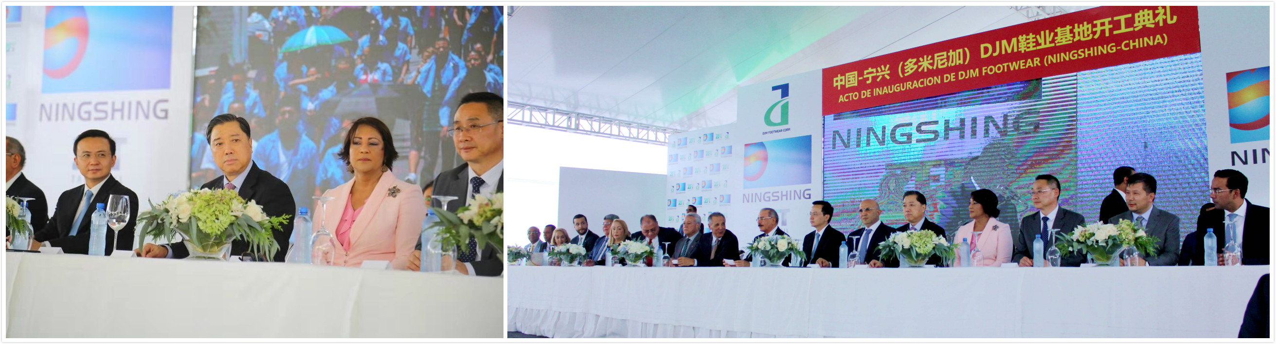 开工典礼在DJM鞋业工厂位于Tamboril坦波利尔自由贸易产业园区的厂房前隆重举行。会场布置庄重大气,红色横幅“中国·宁兴(多米尼加)DJM鞋业基地开工典礼”高悬会场,大会背景板上展示NIngshing、DJM和ZFT(坦波利尔自贸区)三个醒目的logo标识,主席台背景LED屏幕滚动播放着宁兴控股各产业板块图片,向现场嘉宾展示宁兴控股形象。