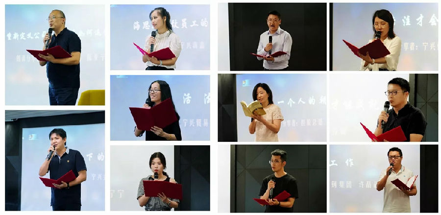 本次活动特别邀请了两位重量级嘉宾。第一位分享嘉宾是宁波电视台著名主持人,中国新闻奖获得者李飒老师。李老师不仅为大家分享了阅读的意义、专注聚焦的内涵和朗读的技巧,还呈现了一场精彩纷呈的现场访谈。宁兴控股董事长吴以刚、总裁黄永增、宁兴贸易集团副总经理李军波、宁兴恒骐总经理朱伟栋和国机宁兴汽车董事长张帆参与互动交流,为大家分享了对“专注聚焦”作为宁兴人座右铭精髓的深层次理解,公司与个人在外贸路上的专注和突破,坚持阅读的力量、丰田工匠精神的经典做法等精彩观点;吴以刚董事长更以宁兴二十多年的专业化发展诠释了专注与聚焦的力量,也向全体宁兴人传递了要学习、思考并学以致用,不断成长的期望。