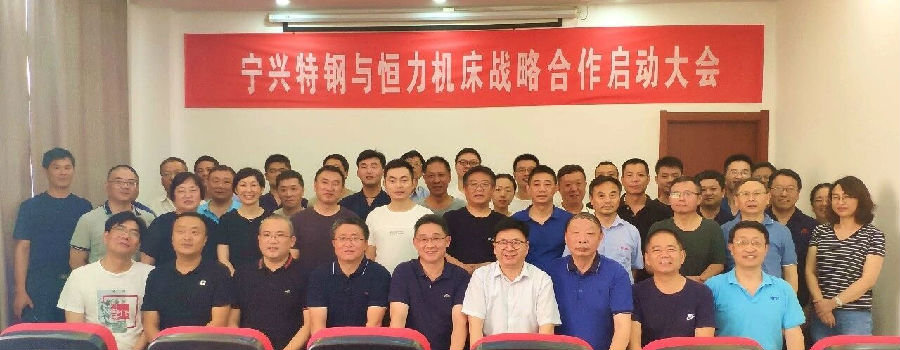 宁兴特钢集团与国家高新技术企业江苏恒力组合机床有限公司于2017年共同投资并成功研发圆盘锯铣机床。为进一步发挥双方优势,延伸产业链,共同打造智能高端装备制造行业的领军企业,双方达成共识,开展新的更全面的战略合作。2020年8月15日上午,宁兴特钢集团与江苏恒力机床战略合作启动会在江苏恒力机床召开。宁兴控股总裁黄永增,副总裁、宁兴特钢集团董事长王文彤,宁兴特钢集团常务副总经理、江苏宁兴恒力董事长陈亚宁,江苏恒力机床董事长仲秋等出席会议,恒力机床和宁兴恒力中高层管理人员、职工代表等50多人参加了会议。