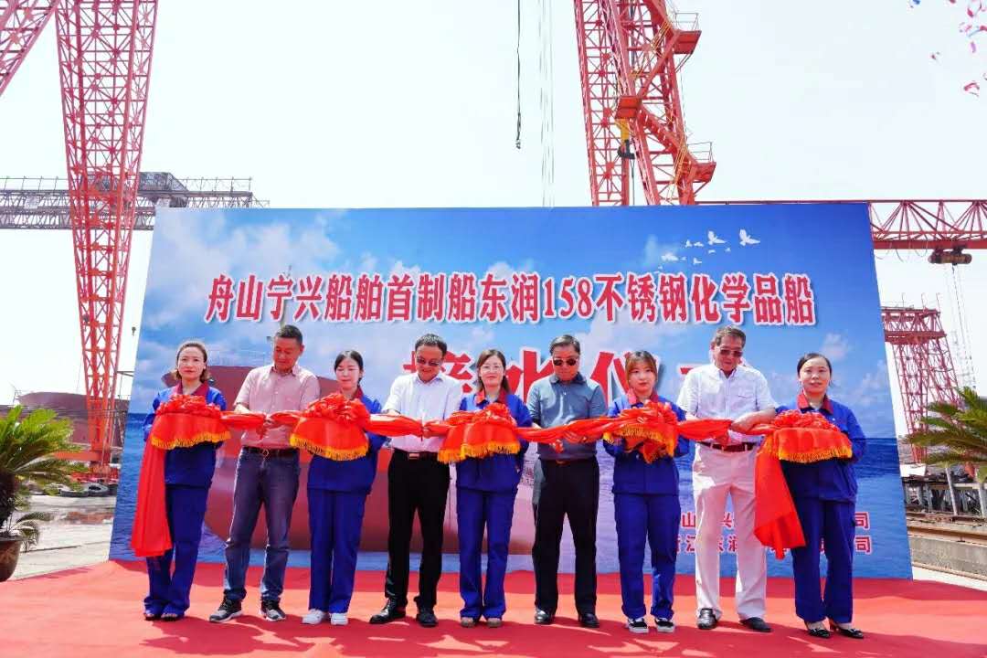 随后,舟山宁兴船舶总经理卫汉祥在船台现场指挥整个接水工作。伴随着礼炮声、鸣笛声,宁兴船舶首制船“东润158”不锈钢化学品船缓缓滑离船台,顺利接水。