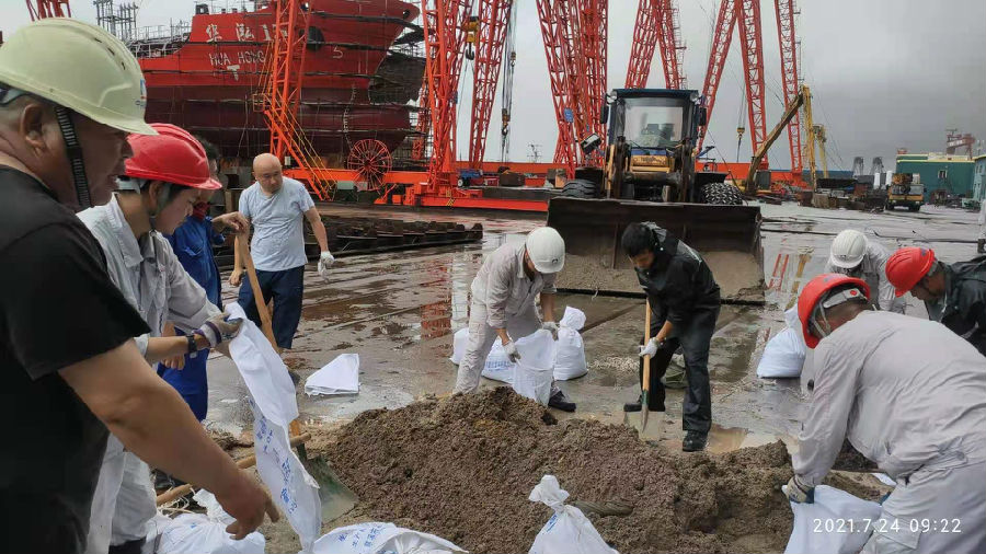 “烟花”来势汹汹,舟山宁兴船舶提前一周启动应急预案,王文彤副总裁全程领导指挥,共转移安置了员工190余人,加固船舶、板房,以及龙门吊等大型设备60余台,组织抢险人员20余人。