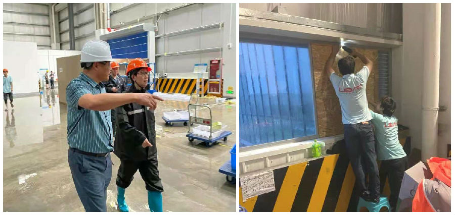 随着“烟花”逐步逼近,宁兴优贝物流各仓库不同程度进水,险情不断,施伟总经理冲锋在前,连续几天带领员工战斗在公司抗台一线,果决排除各种险情。7月25日上午7点半,宁兴优贝物流玉山二号库顶层东西两边楼顶被瞬时大风掀翻,分别产生长100多米、宽达1米左右的两道破损口。玉山二号库经理王吉伟迅速组织人员展开自救,玉山一号库经理陈荣、维修班组组长赵枕波和其他仓员工也迅速赶到现场有序展开共同救援行动,仓库后勤组黎红梅、隋欣等及时组织食物发放给防汛抗台人员补充体力…… 在持续30多个小时的作战下,宁兴优贝物流全体员工齐心协力打赢防台抗台硬仗。期间,保税区管委会副主任夏群、控股公司董事长吴以刚等心系优贝物流,亲临仓库现场,检查指导抗台与复工情况,慰问一线防台人员。