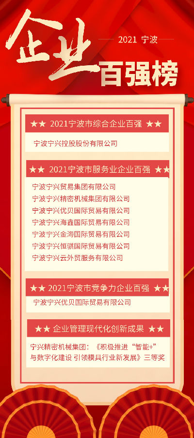 近日,宁波市企业联合会、宁波市企业家协会、宁波市工业经济联合会联合发布了2021宁波市百强榜单。宁兴控股继续入选“2021宁波市综合企业百强”;宁兴控股所属宁兴贸易集团、宁兴精密机械集团、宁兴优贝、宁兴海鑫、宁兴金海、宁兴恒骐、宁兴云外贸同时入选“2021宁波市服务业企业百强”;宁兴优贝还入选“2021宁波市竞争力企业百强”。宁兴精密机械集团《积极推进“智能+” 与数字化建设 引领模具行业新发展》荣获企业管理现代化创新成果三等奖。