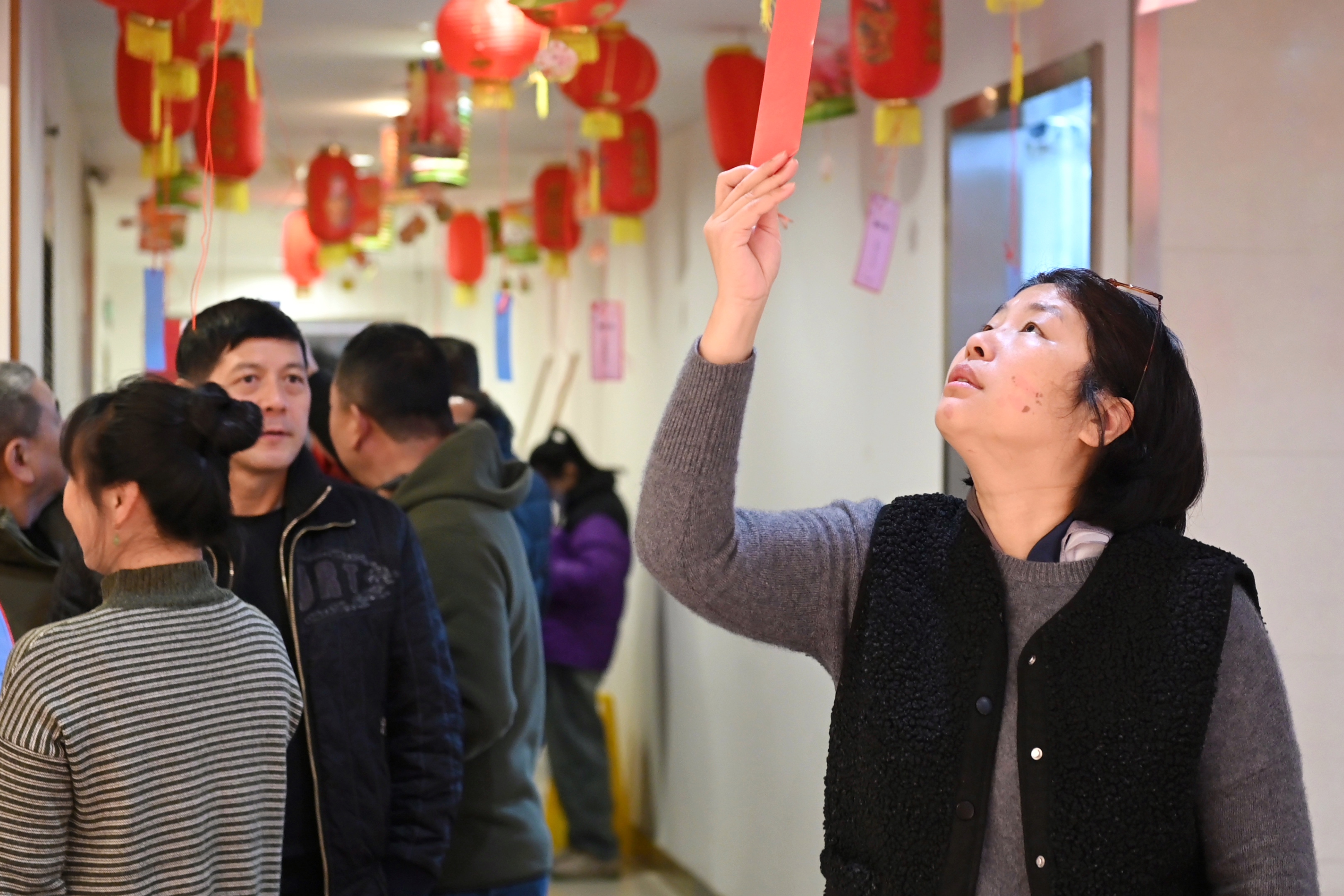 活动现场,红红的灯笼高高挂起,五颜六色的谜语悬挂在灯笼上,谜面内容丰富多样、知识面广、趣味性强。员工们纷纷驻足灯谜处,踊跃竞猜,热闹非凡。