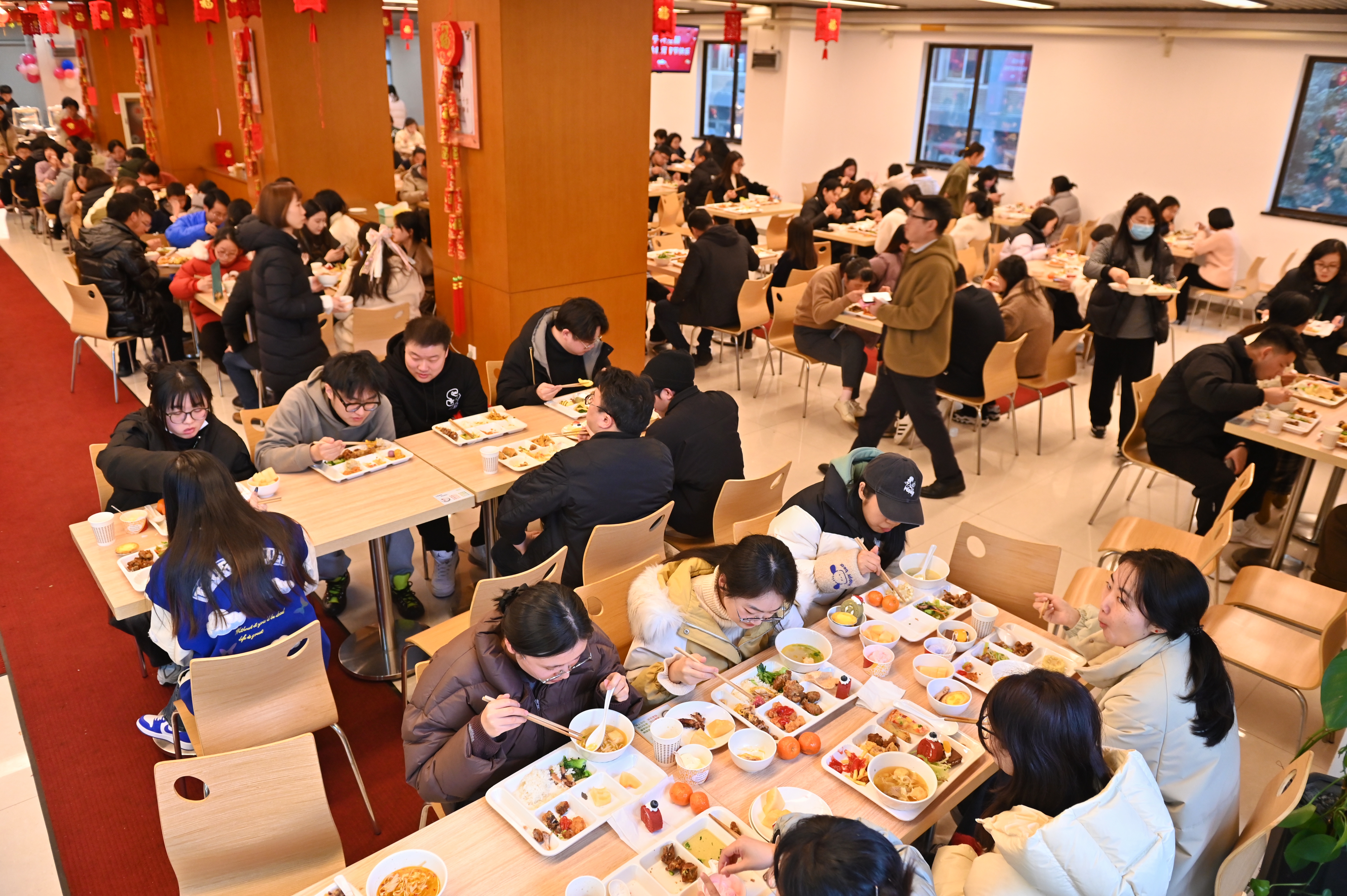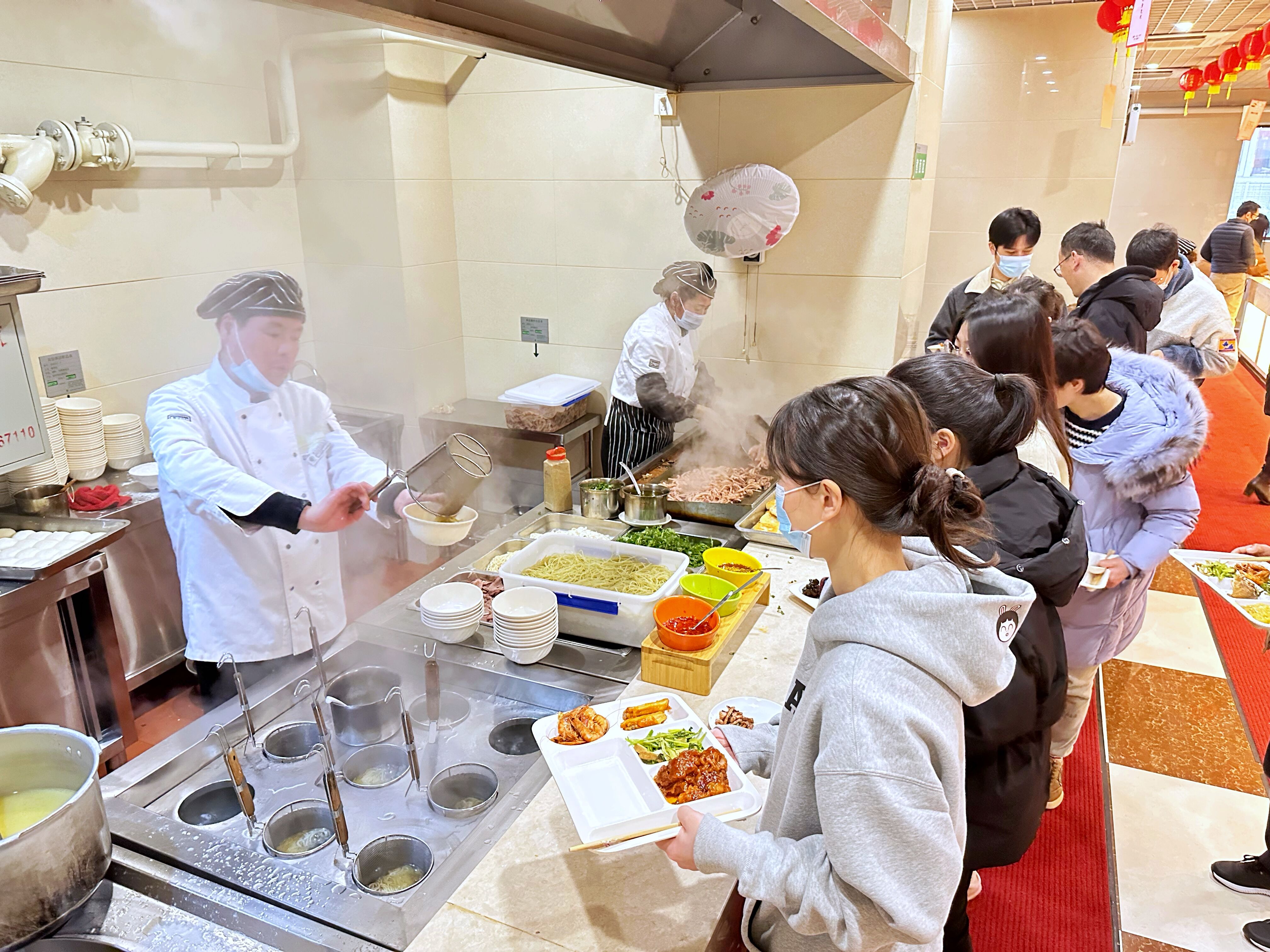 食堂精心准备了丰盛的佳肴,既有各类小炒、热气海鲜、手工牛肉面、香煎鱿鱼、三色汤圆等传统美食,也有沙拉、蛋糕、冰激凌等风味西点。员工们围坐一起,边吃边聊,分享着彼此的春节故事与祝福,继续感受新年的快乐和来自企业的幸福关怀。