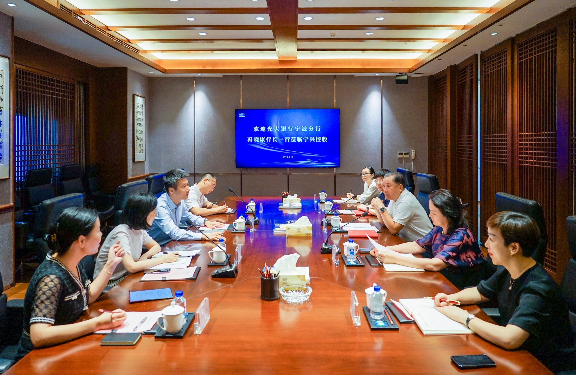 8月19日,光大银行宁波分行行长、党委书记冯晓康一行到宁兴控股调研,宁兴控股董事长吴以刚,副董事长、党委书记高屏,副总裁杨晓君等热情接待并座谈交流。