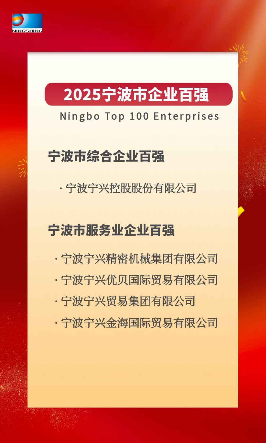 宁兴控股继续入选“2025宁波市综合企业百强”;宁兴控股所属宁兴精密机械集团、宁兴优贝、宁兴贸易集团、宁兴金海同时入选“2025宁波市服务业企业百强”。