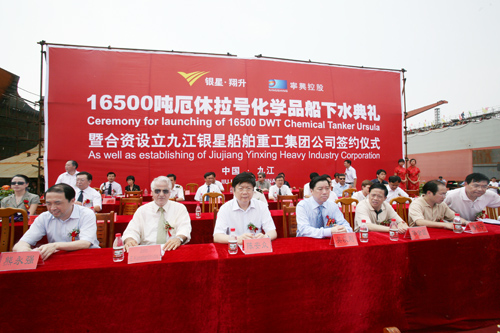 同日并举行了九江银星船舶重工集团有限公司成立签约仪式。九江市委书记陈安众、市委常委秘书长华金国等领导、宁兴控股董事长吴以刚、九江银星造船公司董事长陈志远、以及船东和船级社代表出席了签约仪式并剪彩。宁兴控股与银星造船公司在“厄休拉”号化学品船的建造过程中,通过不断加深了解,增进友情,相互信任,建立了一个良好的长期合作关系。同时,宁兴控股公司也深深感受到九江良好的投资环境和当地政府部门对造船产业的大力扶持,更加增强了投资建设船厂的信心和决心。于是,双方达成共识,由宁兴控股与银星造船和翔升造船共同出资,组建成立九江银星船舶重工集团有限公司。