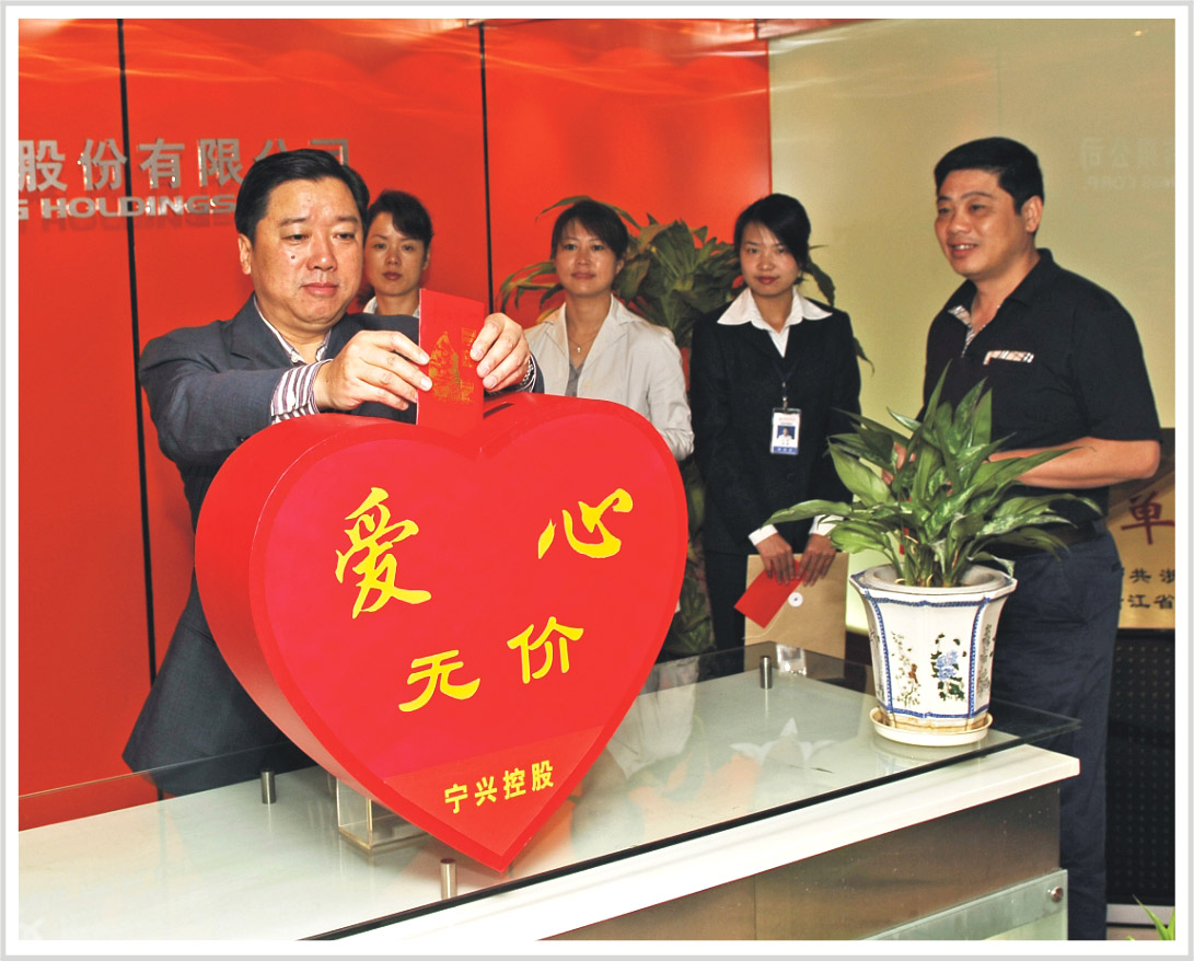 控股公司已举办多年的慈善一日捐活动,为需要帮助的贫困者捐赠一日的工资收入。 宁兴的发展和壮大离不开社会各界的关爱与支持,宁兴控股长期以来一直积极参与慈善公益事业,为帮贫扶困、扶助弱势群体做出努力,并于日前被宁波市慈善总会授予“宁波市慈善楷模”的称号。