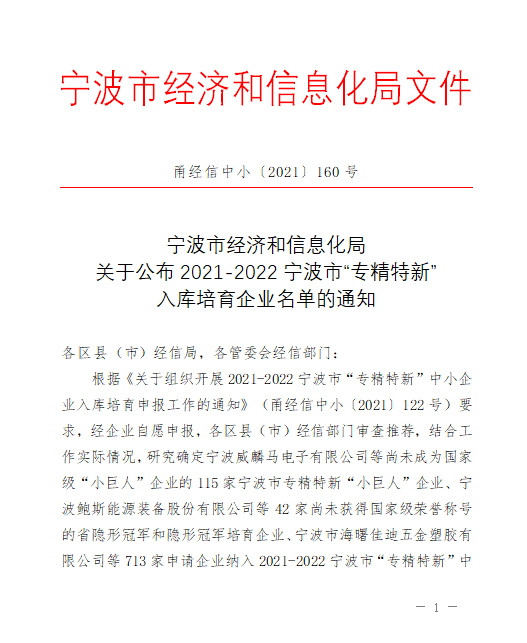 宁兴精密制造有限公司入选宁波市“专精特新”中小企业培育库2021-10-22