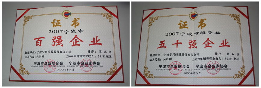 宁兴控股荣获“2007宁波市百强企业”、“2007宁波市服务业五十强企业”称号2007-09-05