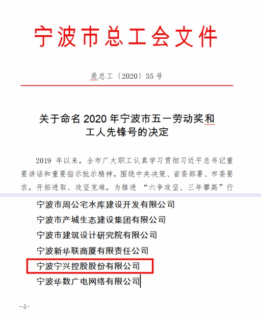 热烈祝贺宁兴控股荣获“宁波市五一劳动奖状”2020-05-08