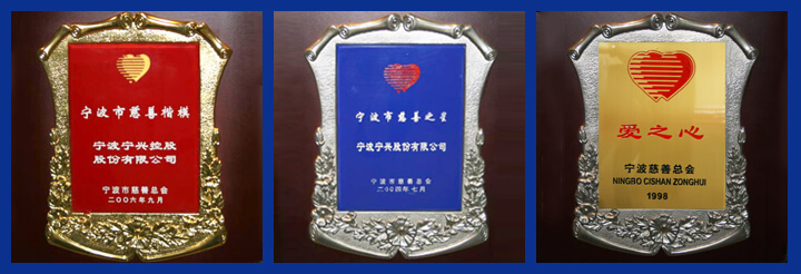 公司多次被评为宁波市对外经贸企业年度大奖“社会责任奖”,宁波市慈善机构奖、慈善楷模等。
